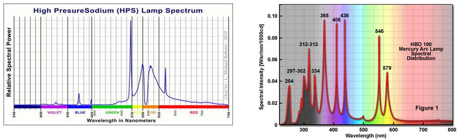 As linhas atribuídas ao mercúrio situam-se em 365, 405, 436, 546, 577 e 617 nanômetros; enquanto que, as linhas de emissão provenientes do sódio situam-se em 570, 583, 600 e 617 nm. O brilho natural do céu possui sua emissão em 558 nanômetros e aparece mais fracamente em torno de 630 nanômetros.