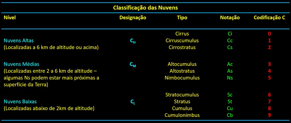 As nuvens resultam do processo de condensação do vapor d'água presente na atmosfera e estão em um contínuo movimento aparecendo nas masi variadas formas. Entretanto, é possível definir um número de características comuns observadas e, assim, agrupa-las e classifica-las. A Organização Mundial de Metereologia (WMO - Wolrd Metereological Organization) realizou uma classificação destas características de forma a capacitar um observador a relatar os tipos de nuvens presentes em seu local de observação.